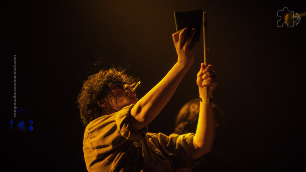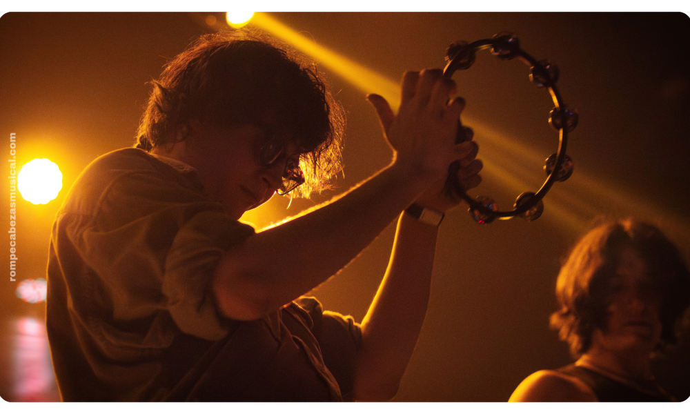 Ariel Mirabal Nigrelli, quien canta la mayoría de las canciones acompañado de la guitarra, se ubica en el extremo izquierdo como un anti-frontman. Llevaba lentes oscuros y una remera que rezaba “I ♥ Jesus”. La formación se completa con Santiago Vidiri en bajo, Francisco Cirillo en batería y Ricardo Morales en guitarra. Uno de los roles más interesantes es el de Gabriel Torres Carabajal, ubicado en el centro del escenario tocando la pandereta desarmandose como Jack Black en Escuela de Rock mientras se prende un pucho tras otro. Ese tintineo constante que le da la agudeza que necesita tanta distorsión acompañada por cencerro y maracas. Lejos de ser un elemento secundario, muchas veces relegado como ser el arquero del partido con amigos, convirtieron la pandereta en protagonista.